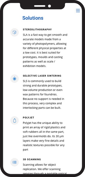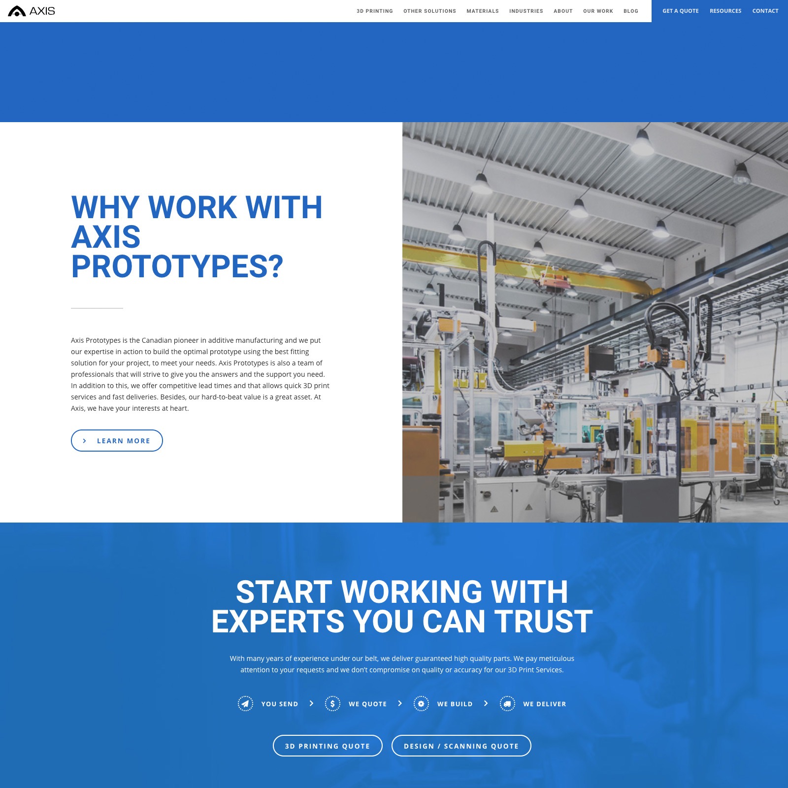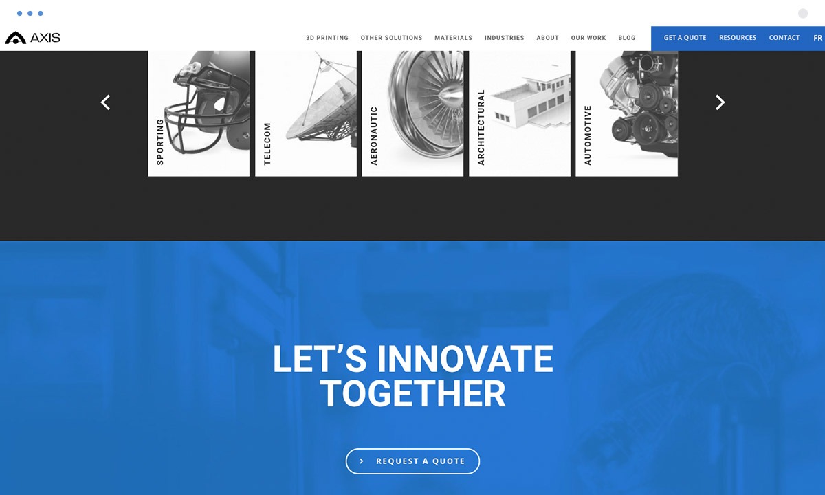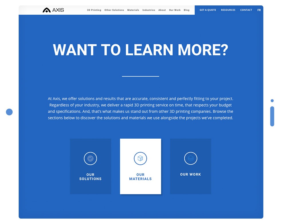 To best serve AXIS, we first had to do a thorough investigation of the Rapid-Prototyping industry, analyzing both the services our client provided and the corporate audience to whom they would be catering. This analysis was essential to the design process of the website and search engine optimization, as it indicated the audience we would be targeting with our efforts. AXIS clientele is mostly comprised of engineers and product developers looking for industrial, high-grade services, and the website needed to reflect a clean, modernized image that highlighted the capabilities and trust AXIS assures.